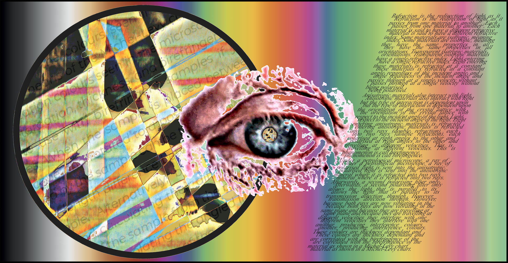 The circular image was created using cellotape on a plastic film (not an actual rock thin-section), the polarised light from a computer monitor and a sheet of Polaroid film. This image was captured by a Nikon D40x SLR. The artist’s eye was captured selfie-style using a Pixel 7 camera. The colourful background is based on the birefringent colours displayed in a Michel-Levy chart while excluding the important graphical elements of the chart for the purposes of the art. All images were processed, manipulated and combined using Affinity and Paint Shop Pro software with no AI assistance.