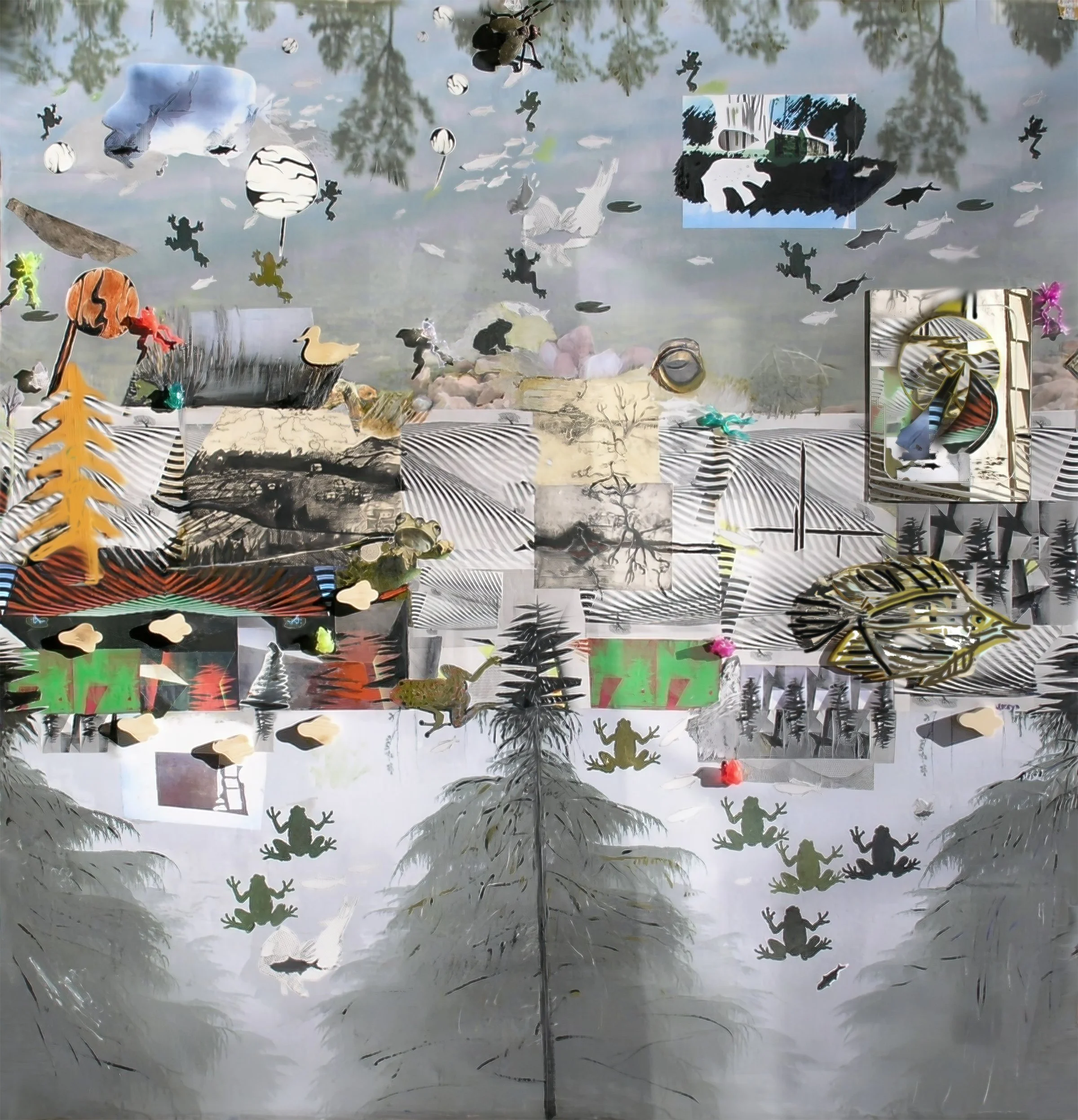 The image consists of computer code output in black & white, color in a form of photo-silkscreens and photolithographs, mixed with photographic content: sketches, traditional printmaking, photoshopped together with painterly markings. No AI was involved. I tend to make my work large to provide the audience with space and distance to view the artwork properly.