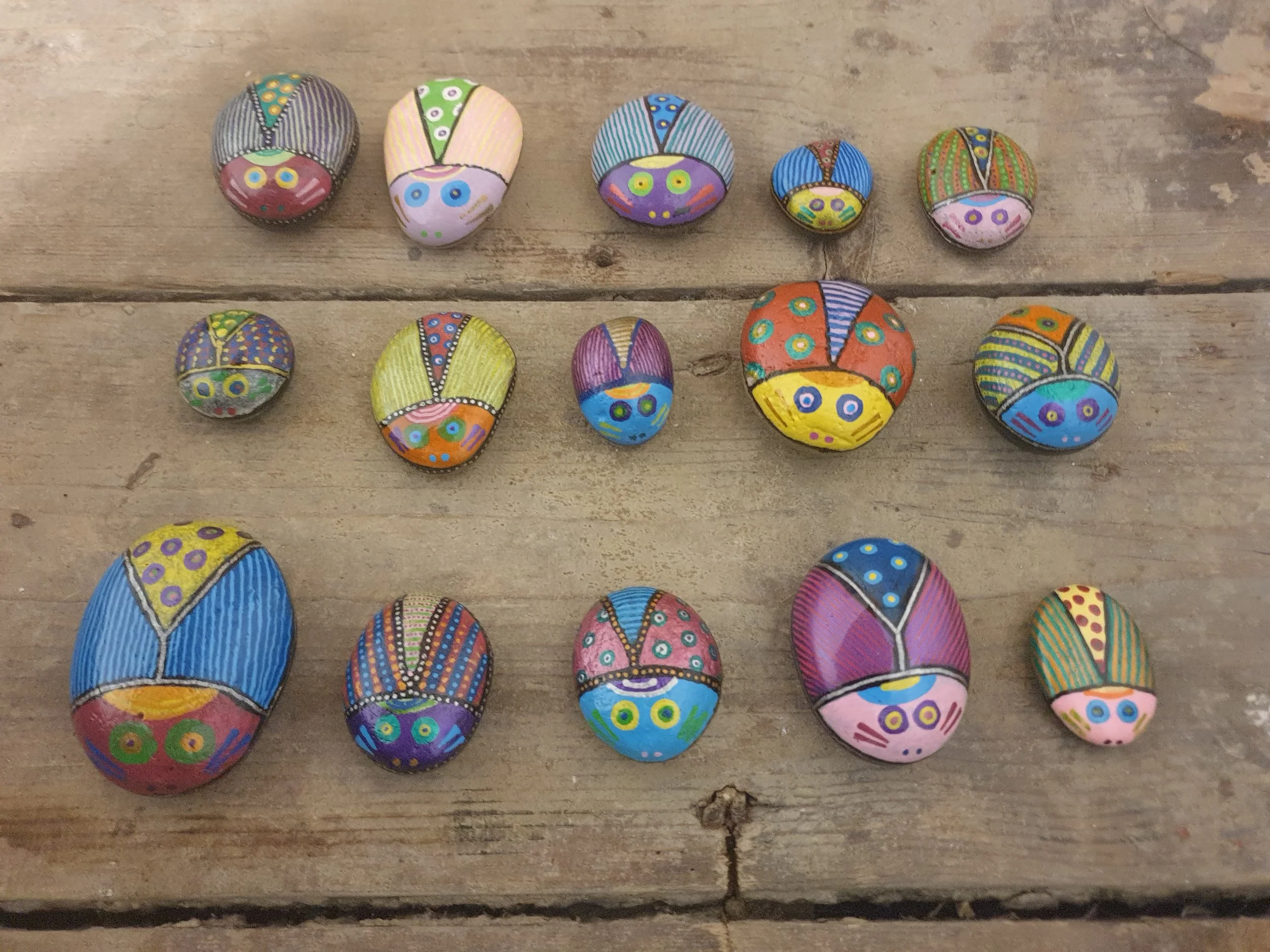The beetles were created using acrylic paint on stone and finished with clear lacquer.