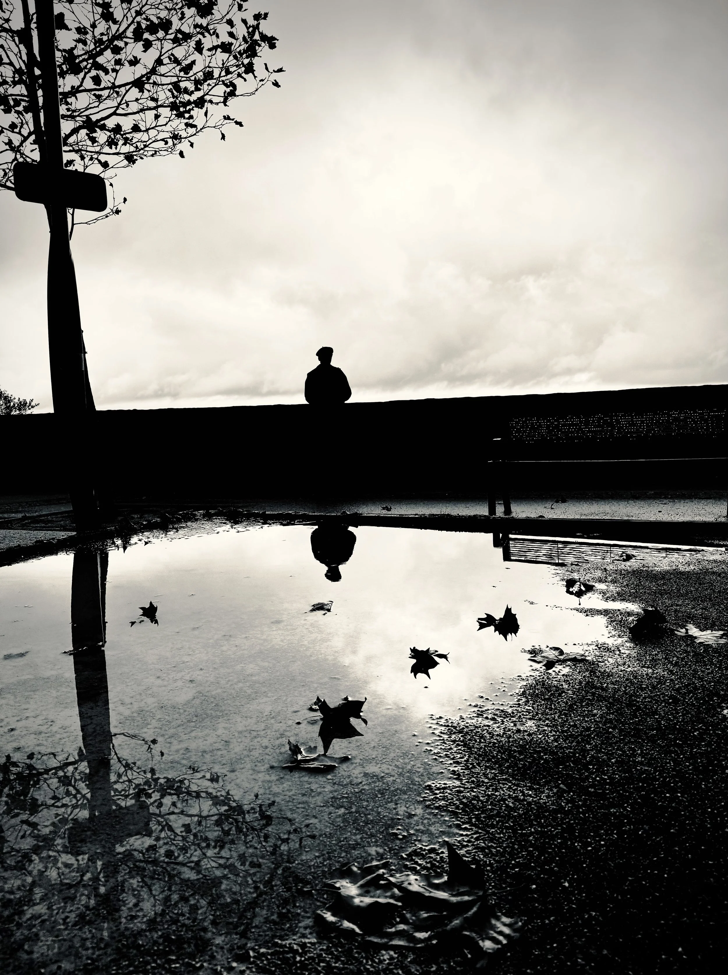This is a photograph taken outdoors on a rainy day in a small, anonymous town somewhere in Europe. It has been digitally edited (in Photoshop) to appear in black and white with strong contrasts, emphasising the mirrored reflections of an anonymous figure in a puddle of water. The subject, shown with the back turned to the viewer, is captured in a seated position, possibly reflecting on “a time that has gone” and contemplating life change through migration, while gazing into the open air.