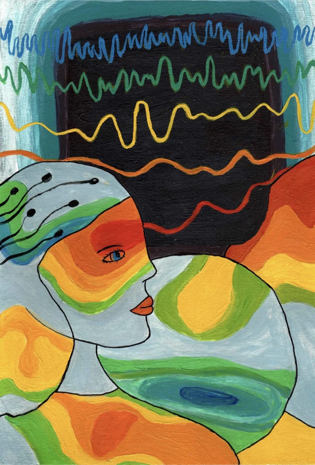 The painting was created with acrylic paint on 8.3inch x 11.7inch paper. The colorful patterns in the painting are taken from my own quantitative EEG (qEEG) analysis— more specifically, from topographic maps of EEG Z-score values of different types of brain waves across my brain at the time of the recording. The oscillating lines represent different types of brain waves. In order from top to bottom: gamma, beta, alpha, theta, and delta waves.