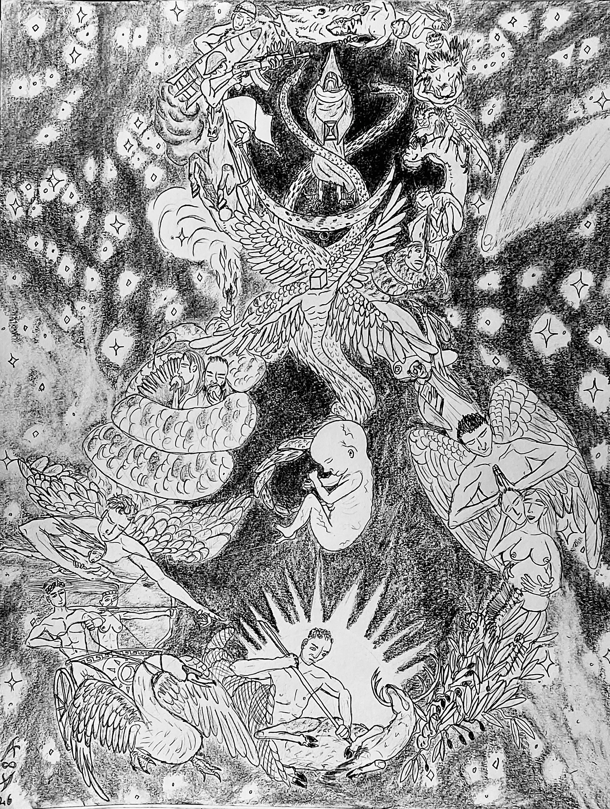 The word ‘Theogony’ is of Ancient Greek derivation and is the nomenclature of divine genealogy. Given that Ancient Greek deities are sometimes interpreted today as archetypes for human action, it seemed only fitting to give this title to a piece portraying our species’ inception. The drawing was completed using a standard array of graphite pencils on cartridge paper, measuring 21 x 28 cm. It was produced by hand using only imagination and occasional self-modelling for certain tricky bodily positions. It was then photographed using a Galaxy A71 phone and the final image processed using Adobe Photoshop to increase monochromatic definition.