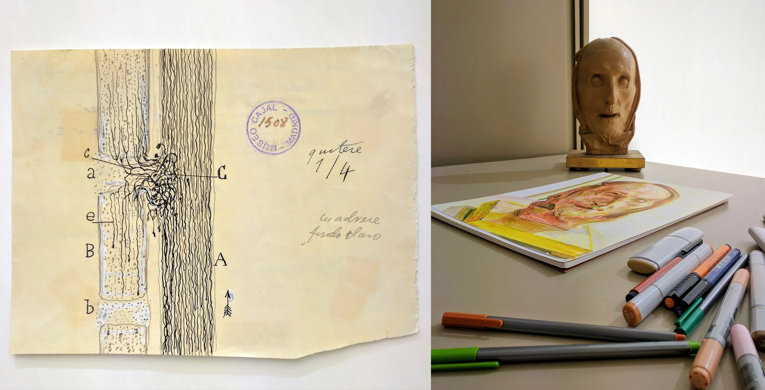 An example image of Cajal’s regenerative neuron illustrations (left), and Cajal’s death mask mold along with art created by Dawn Hunter during a Fulbright Spain Senior Research Fellowship to the Instituto Cajal in Madrid, Spain (right). Cajal's scientific drawing and death mask are reproduced here courtesy of the Instituto Cajal, Madrid.