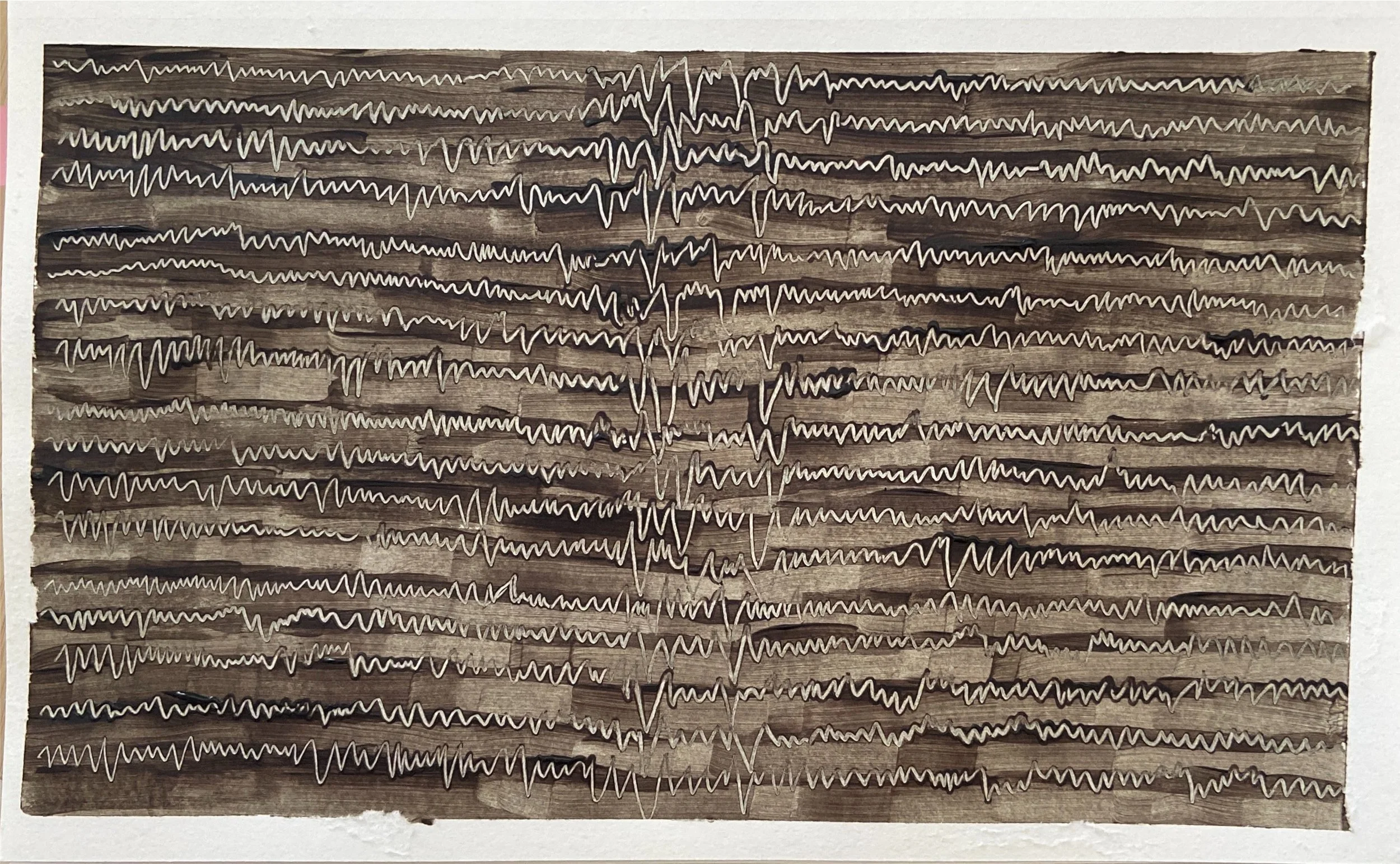 This painting presents a sample EEG of an adult person in a transitional sleep state, exemplified by the lower-frequency "theta rhythms" that emerge from the background activity - but with the recorded lines reflected through etchings into wet paint.