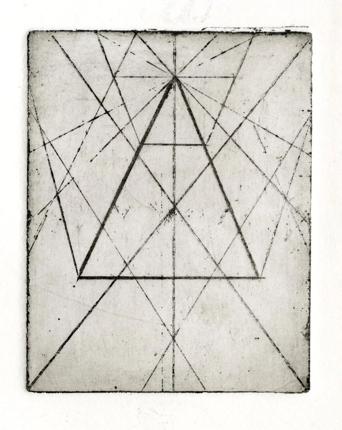 Using origami, Leanne constructs geometric shapes found within a virus structure and then unfolds them, creating prints based on the crease patterns of the paper. This transcends dimensions, moving from three into two evoking the idea mathematical nets used to build a form back into three dimensions.
